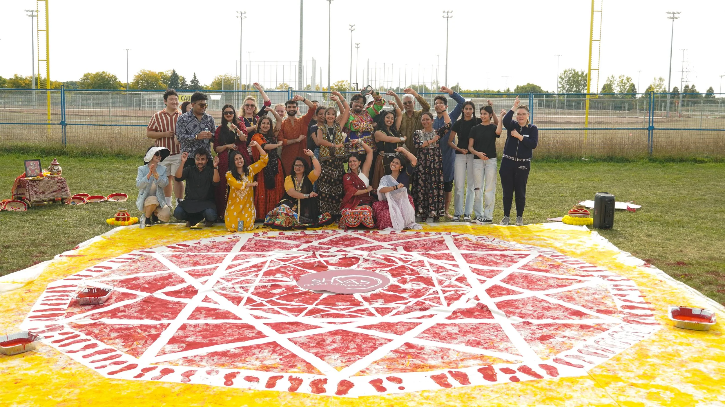 Rangamandal 2025: Canvas of Collaboration is a participatory community arts program that brings people together through movement, tradition, and collective creation. Inspired by the circular, communal nature of Garba, participants engage in a shared dance art-making experience on a 20 ft by 20 ft canvas, using paint-dipped feet to transform movement into visual art.